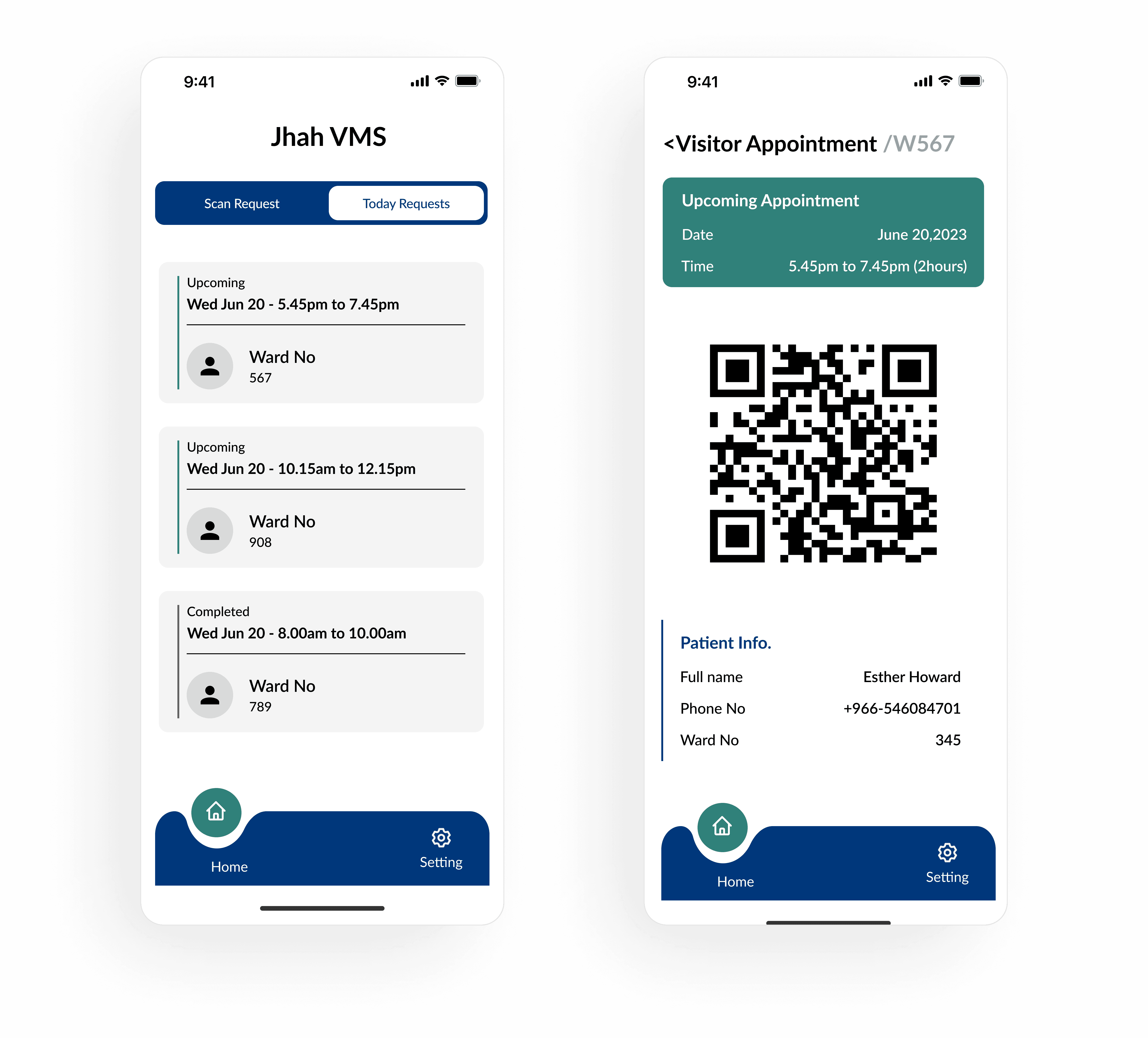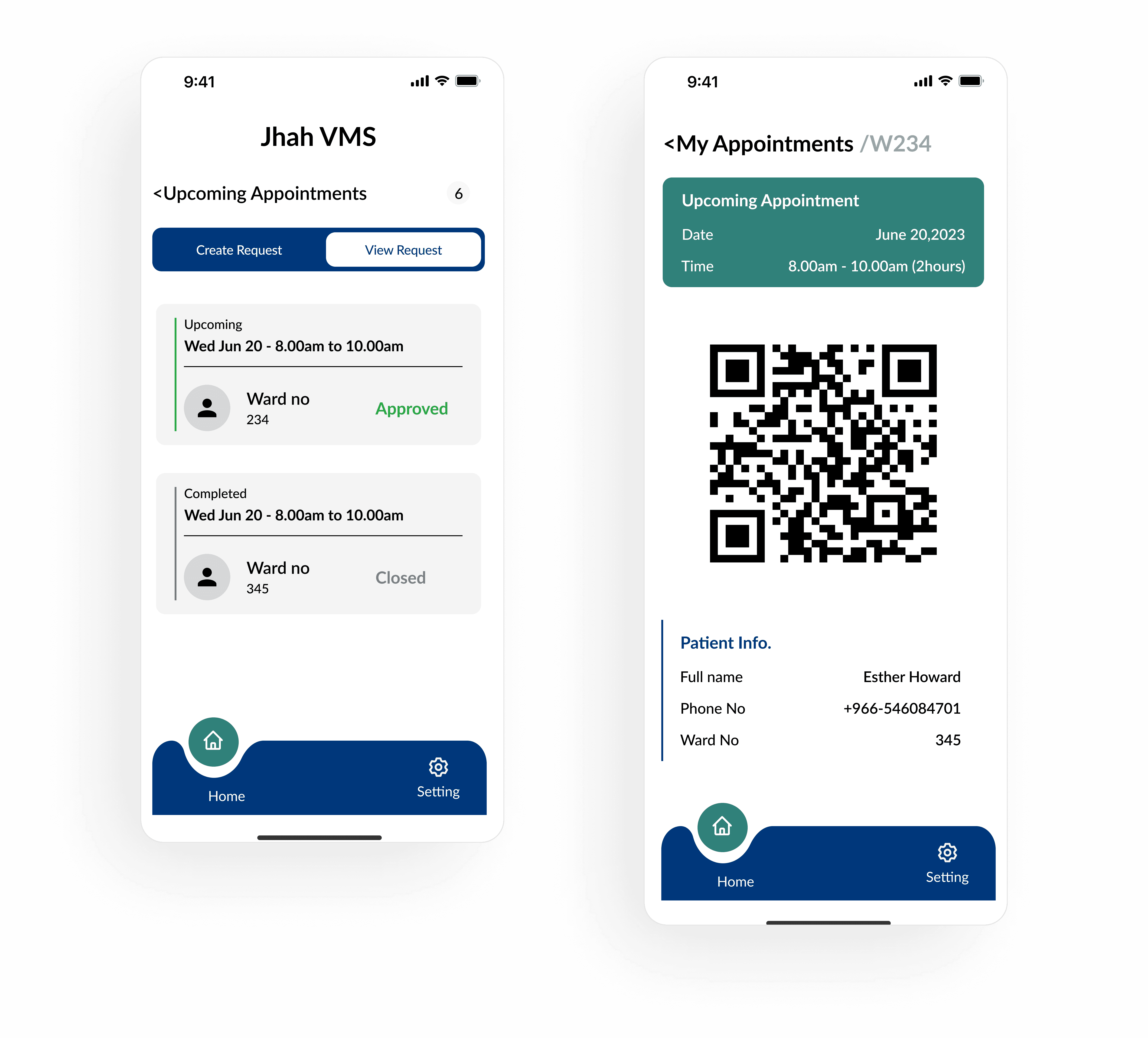 Visitor – View Request: View upcoming, approved, or completed visit requests with patient QR and info.