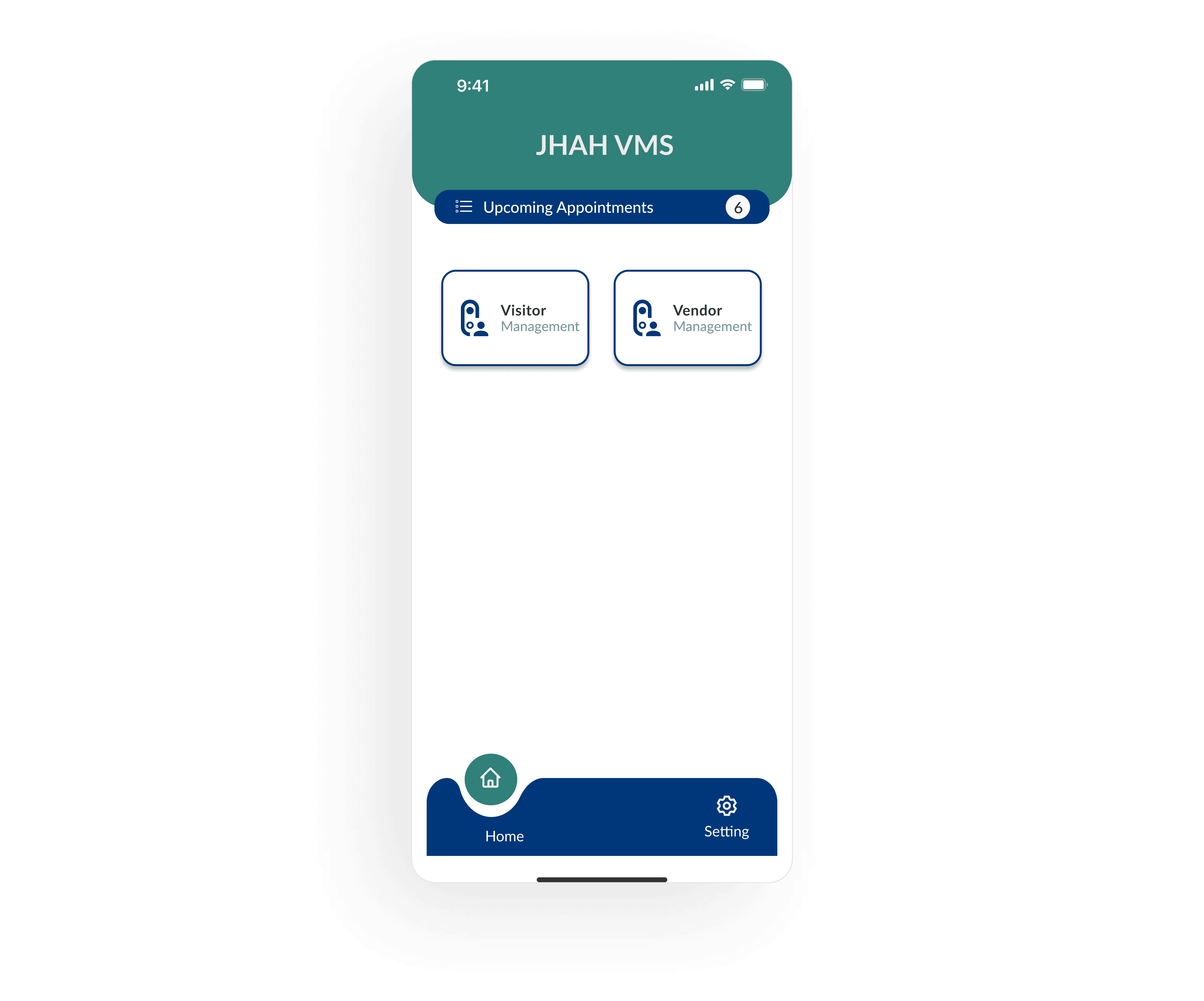 Home Page: Quick access to Visitor or Vendor Management; shows number of upcoming appointments.