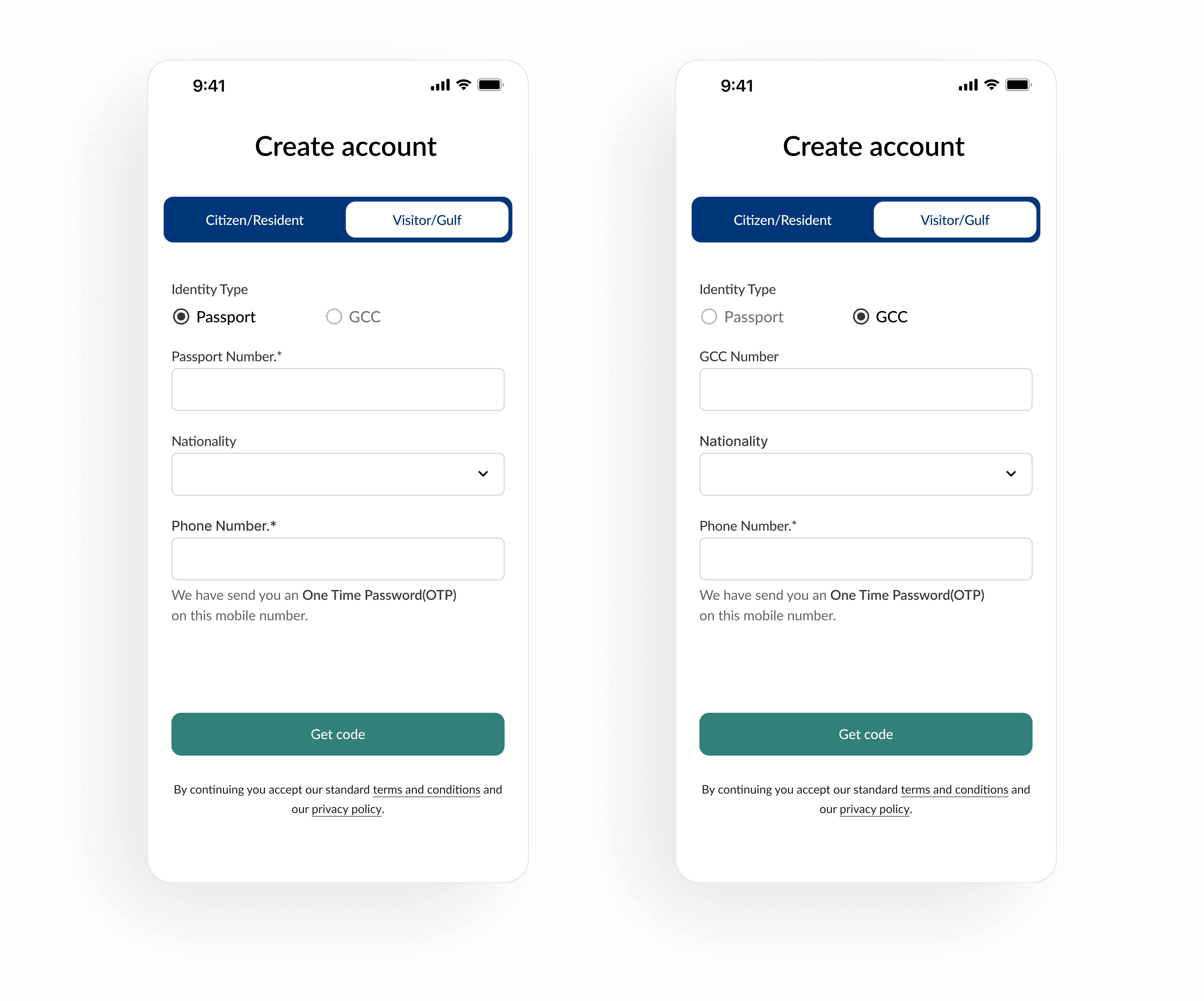 Citizen/Resident & Visitor/Gulf Registration: Split user flows to reduce friction; used ID types like National ID, Passport, GCC.