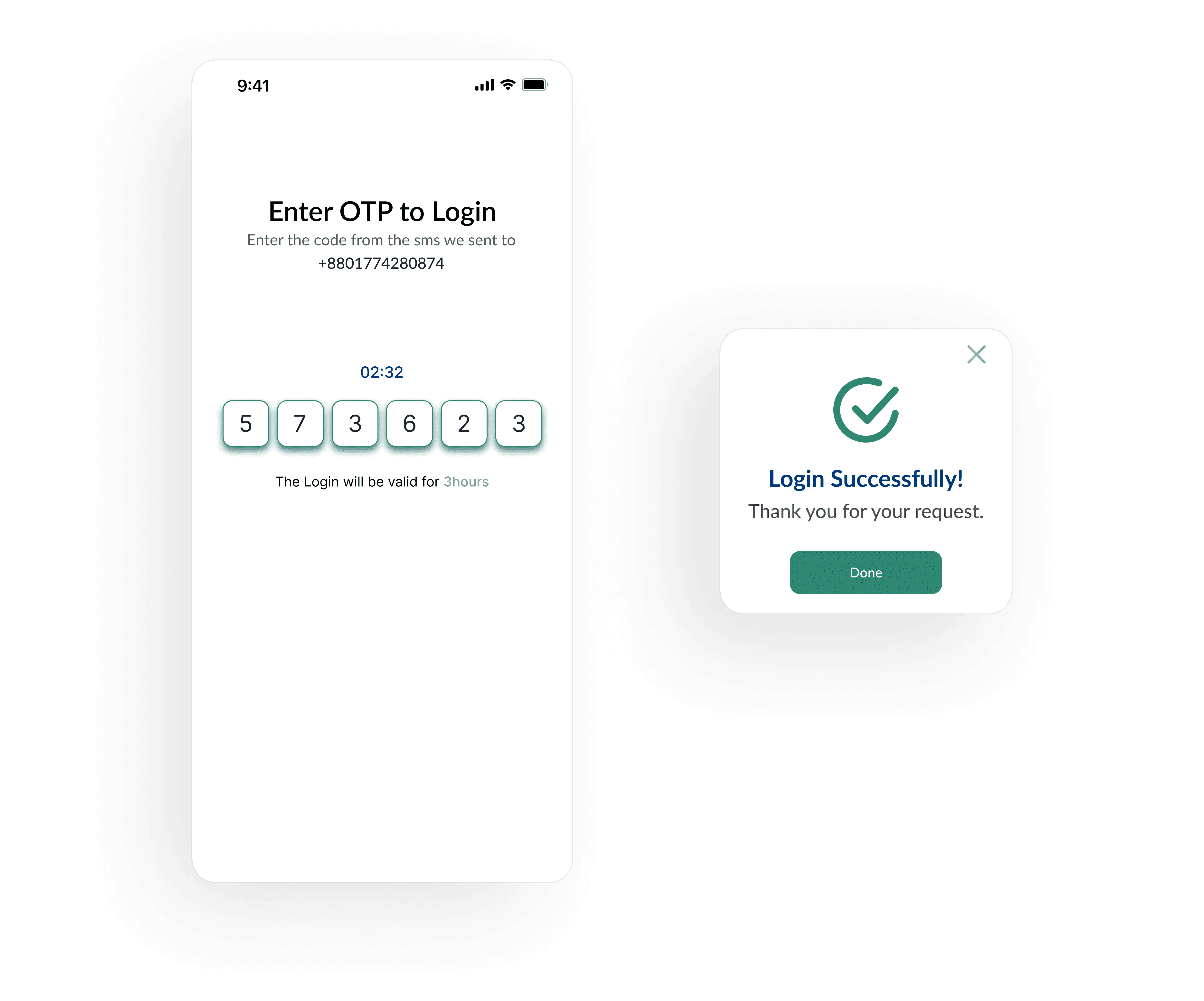 OTP Login Screen: Valid for 3 hours; provides secure and seamless entry point.